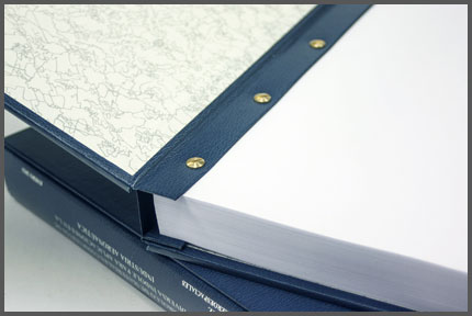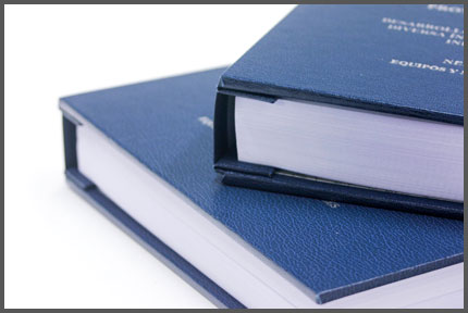 The binding process is a craft, using graphic card of 300 gr. geltex lined, guaflex telflex, or other fabric (see cover materials catalog). Cover and spine is embossed according to the design provided by the customer in gold, silver or colours through a pressure and heat system for a durable finish.